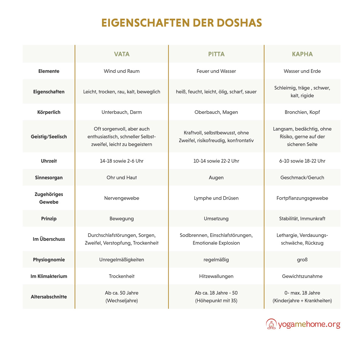 Auf diese drei Bereiche und insbesondere die Ernährung während der Wechseljahre möchte ich in diesem Artikel genauer eingehen. Doch bevor es los geht, siehst Du in der folgenden Tabelle eine Übersicht über die Eigenschaften der Doshas. Doshas bezeichnen deine Grundkonsitution. Alle Menschen lassen sich drei Typen zuordnen, wobei wir in der Regel von allen dreien etwas haben, aber eines der Doshas ist dominant. Das ist dann dein Dosha-Typ. Hier eine erste Übersicht, bevor wir auf die richtige Ernährung für jeden Dosha-Typen während der Wechseljahre eingehen.